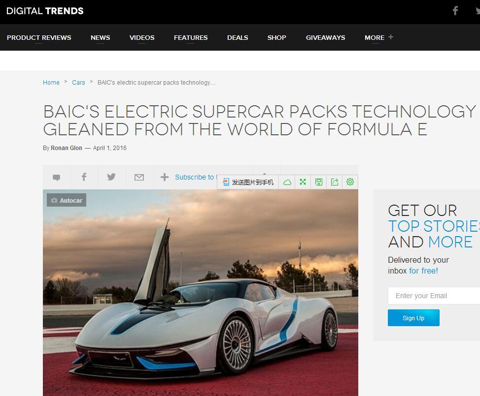 美国媒体Digital Trend题为“北汽电动超跑云集了Formula E电动方程式赛车的先进科技”的报道指出,中国北汽的设计让人印象深刻。该车由北汽和参与Formula E比赛的NextEV共同设计,采用由电驱动的动力系统。