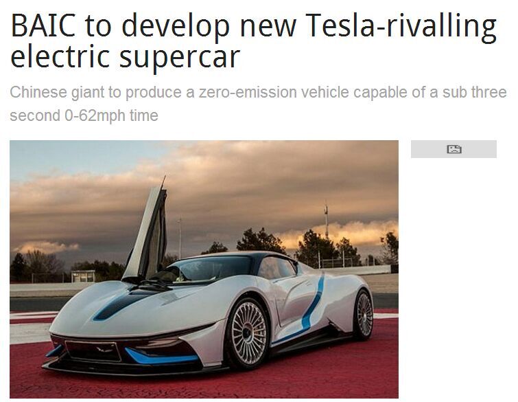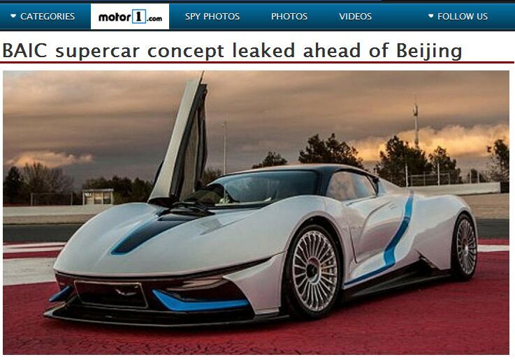 文章援引Autocar的报道称,中国的北汽集团将在本土举办的北京车展上展出这款超级电动车,北汽将直接竞争美国的电动汽车公司Faraday Future,克罗地亚的超级跑车品牌Rimac和瑞典的超级跑车制造商科尼赛克。
