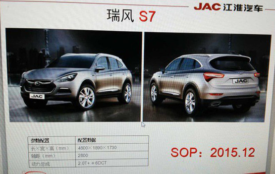 凤凰汽车讯 日前,网络上曝光了一组疑似江淮全新SUV瑞风S7的外观图片及部分信息。据悉,新车将搭载1.5T/2.0T涡轮增压发动机,并匹配6速双离合变速器,预计将于今年下半年正式上市。
