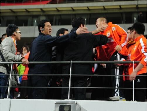 中场休息时,有网友爆料称,有几名鲁能球迷同现场的安保发生了冲突。据这位网友的爆料,冲突的起因是韩国安保要求没收鲁能球迷协会会旗和国旗,而鲁能球迷予以了拒绝。在双方理论的过程中,有一名鲁能球迷被韩国安保一把推倒在地。