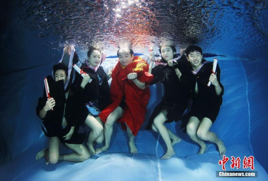 近日,福建师范大学协和学院2016届毕业生,在4.5米深、能见度只有20厘米的福建省体育中心游泳馆,拍摄了一组“史上最高难度”毕业照。协和 摄